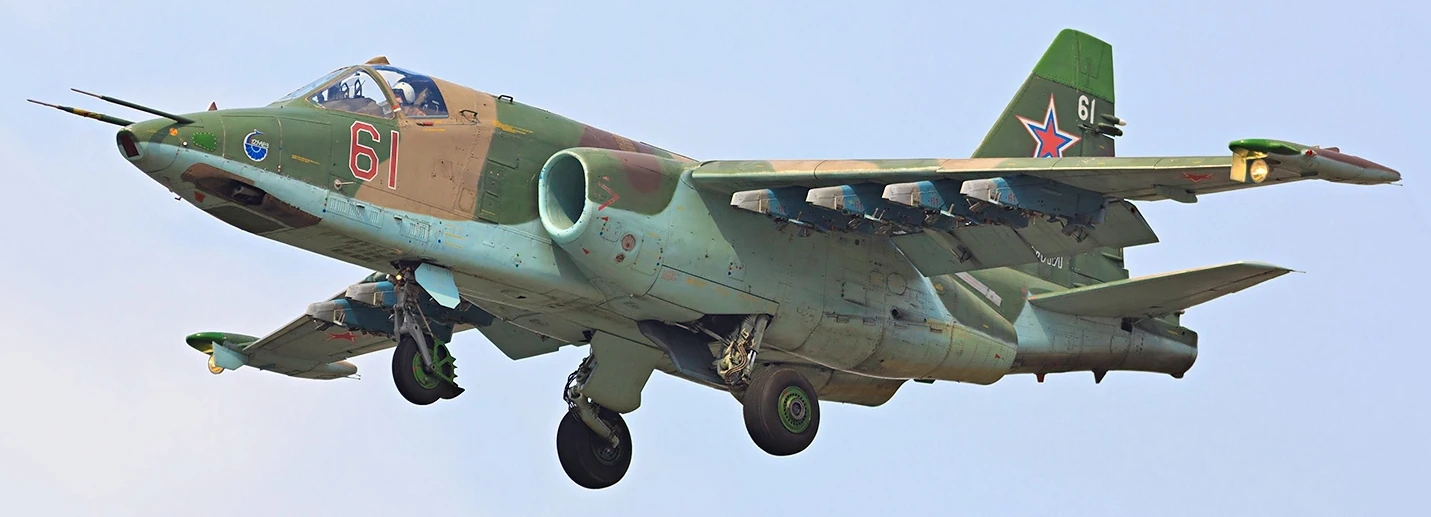 | “ | The Su-25 'Grach' (Rook), NATO callsigned 'Frogfoot', is a dedicated strike attack aircraft designed for the close air support and anti-tank roles. The Su-25 has seen combat in several conflicts during its more than 30 years in service. The Su-25 combines excellent pilot protection and high speed compared to most dedicated attack aircraft. It can be armed with a variety of weapon systems including guided missiles, bombs, rockets, and its internal 30mm cannon. | ” |